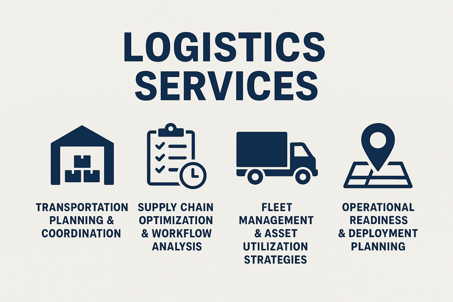 Our solutions are designed to meet the full spectrum of logistics planning and implementation needs for our clients. We provide expert consulting services that focus on identifying challenges, optimizing processes, and developing actionable plans that drive real results. From initial assessment to execution, our team delivers practical, mission-ready solutions that strengthen operational efficiency and support sustained success. Through collaboration and innovation, we empower businesses to achieve their strategic goals seamlessly.